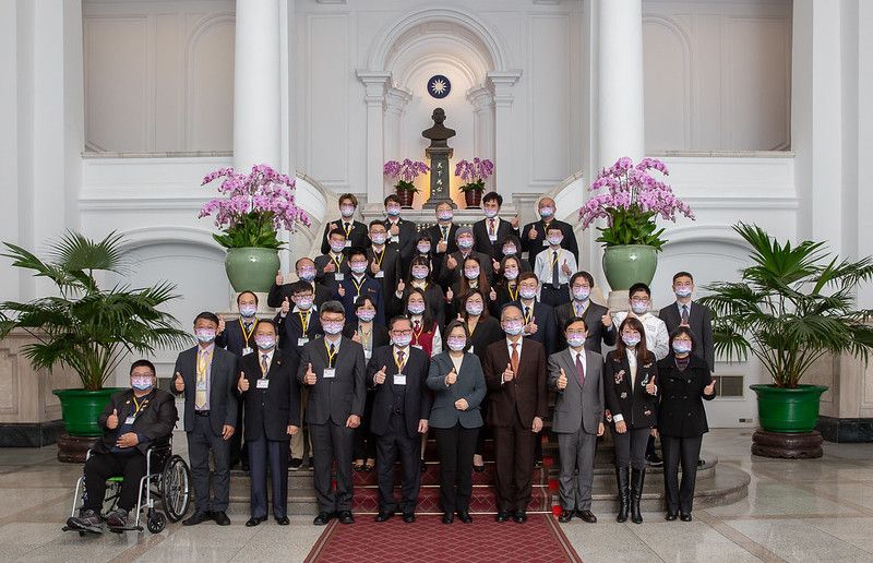 La presidenta Tsai Ing-wen (primera fila, quinta a la derecha) se reúne con los ganadores del Premio Internacional de Inventores de este año en la Oficina Presidencial el 22 de febrero en la ciudad de Taipei. (Foto cortesía de la Oficina Presidencial)