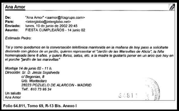 Según las informaciones de la UDEF que han sido aportadas al sumario del Caso Gürtel, además de regalos y prebendas varias, viajes familiares a Dublín, Marbella, Mérida, Tenerife, Jerez de la Frontera y Santiago de Compostela, y un billete de ida y vuelta a Perú para la asistenta peruana, la trama Gürtel pagaba las fiestas de los hijos de Ana Mato. En una de dichas celebraciones se gastaron 4.7000€ en echar confetti, y otra llegó a costar 7.300€. Una incluyó tres payasos según el presupuesto: "tres payasos serán los protagonistas y acercarán a los asistentes haciéndolos interactuar y causando risas, curiosidad y extrañeza".