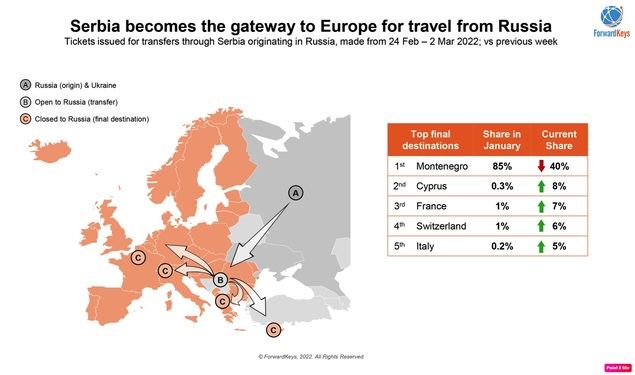60% more flight tickets were issued for travel from Russia to another destination via Serbia in the week immediately after the invasion, than there were in the whole of January. Also, in January, 85% of transfers from Russia via Serbia were to Montenegro; in the week after the invasion, the figure was 40%, as Serbia became a hub for onward travel to Cyprus, France, Switzerland, Italy and elsewhere.