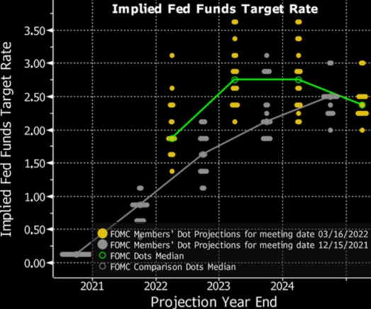 El gráfico de puntos del FOMC se ha revisado al alza para 2022, con una expectativa media de 7 subidas de tipos este año