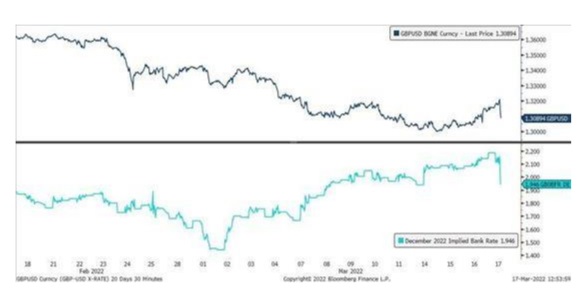 Como muestra de que el impacto de los acontecimientos en Ucrania sobre la inflación es superior al crecimiento, la declaración de tipos refleja que "puede ser apropiado un pequeño endurecimiento de la política monetaria en los próximos meses". Esto sugiere, junto con la solidez de los recientes datos del mercado laboral y del PIB, que el Banco de Inglaterra votará en mayo a favor de subir los tipos hasta el 1%, momento en el que se debatirán las ventas de activos entre los miembros del MPC.