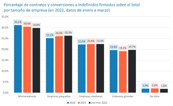 En marzo terminó el periodo de transición que estableció la reforma laboral para adecuar los puestos a la nueva fórmula de contratación que plantea la ley, por lo que el mes de abril ha sido el primero en el que las nuevas contrataciones provienen netamente de las medidas planteadas por el nuevo sistema laboral. Casi la mitad de los contratos firmados en abril (48,2 %) fueron indefinidos. En diciembre de 2021, supusieron solo el 10 % del total.