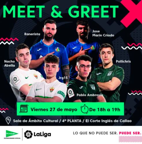 El Corte Inglés acogerá mañana 27 de mayo en la Sala de Ámbito Cultural del centro de Callao, en Madrid, un encuentro muy especial entre jugadores de fútbol profesional de la eLaLiga Santander y aficionados a esta competición de videojuegos. El Corte Inglés ofrece un Meet&Greet exclusivo para los más expertos en el juego de la FIFA.
