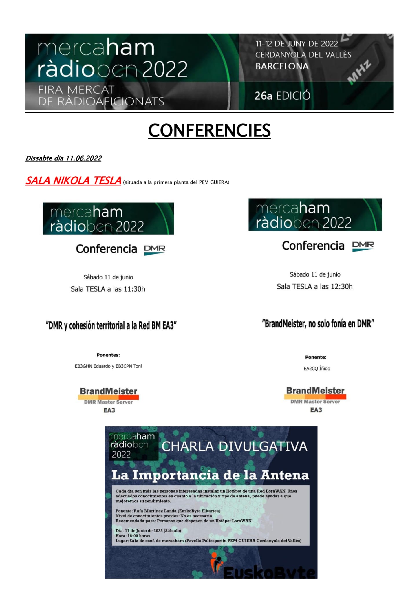 No obstante, uno de los ejes neurálgicos de la edición de este año serán las conferencias. Así, la primera será ‘DMR y cohesión territorial a la Red BM EA3”, a cargo de EB3GHN Eduardo y EB3CPN Toni; la segunda, ‘BrandMeister, no solo fonia en DMR’, será impartida por EA2CQ Íñigo Bastarrika, de Vitoria, mientras que la última, ‘La importancia de la antena’, tendrá el liderazgo de EB2DJB Rafael, de Bilbao.