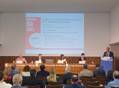 Coincidiendo con la celebración de la Semana de la Inversión Socialmente Responsable (ISR), el Grupo Caja de Ingenieros ha colaborado, junto a Spainsif, en la organización de una mesa redonda sobre tendencias de los criterios sociales en la inversión sostenible, un acto en el que diversos expertos en gestión de inversiones han compartido sus puntos de vista sobre la integración de los factores sociales en la toma de decisiones de inversión. Arnau Guardia, Portfolio Manager en Caja Ingenieros Gestión; Alex Bardaji, Director Southern Europe Glass Lewis; Amparo Ruiz, Country Head de DPAM para España y Latam; y Eva Hernández, Responsable de finanzas sostenibles del Instituto de Estudios financieros de Barcelona (IEF), han formado parte del panel de expertos en una mesa redonda moderada por Javier Garayoa, Director General de Spainsif. Además, Xavier Fàbregas, Director General de Caja Ingenieros Gestión, también participó en la sesión.