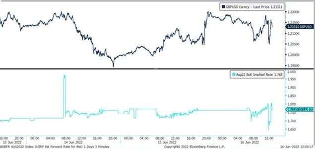 La libra esterlina ha reaccionado con fuerza a la decisión de hoy. Después de vender inicialmente a medida que los mercados de tipos de interés preveían una política más moderada en el futuro -la perspectiva de una subida de 50 puntos básicos en agosto se descontó brevemente de los swaps de tipos de interés a un día-, el retroceso en los precios del mercado monetario hizo que los operadores de la libra esterlina aprovecharan la caída. Las próximas 24 horas van a ser muy importantes para la libra, ya que mañana por la mañana se publicarán los datos de las ventas minoristas de mayo, poco después de que el Banco dijera que el consumo está resistiendo de momento el aumento de la inflación. Sin embargo, la publicación de los datos se ha retrasado al próximo viernes, lo que significa que habrá que esperar hasta la semana que viene para vivir otra sesión de mayor volatilidad cuando el calendario de datos también incluya el informe del IPC de mayo.