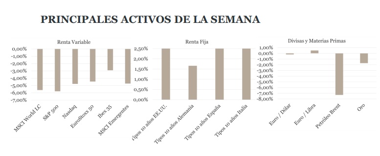 Los BC dieron el zarpazo del oso a las bolsas, llevándolas oficialmente a un mercado bajista (“bear market” en inglés), acumulando pérdidas superiores al -20% desde niveles máximos. Un tono generalizado más restrictivo por parte de los principales Bancos Centrales evidenció el hecho de que la prioridad actual es la lucha contra la inflación, con el crecimiento estando en un segundo plano, al menos hasta que los precios comiencen una desaceleración más rotunda. La Fed subía 75 p.b. sus tipos de interés, el SNB y BoE extendían su ciclo de subida iniciado ya hace algunos y el BCE, tras la desafortunada reunión de la semana anterior, convocaba una reunión de urgencia para acotar el riesgo de fragmentación de las primas de riesgo en la Eurozona. Todos menos Japón parecen estar en la misma página. En ese contexto, las bolsas globales sufrían su peor semana desde marzo de 2020, pero el movimiento que realmente marcaba la pauta del resto de los activos era el de los bonos, con el 10 años de EE.UU. y Alemania alcanzando el 3,47% y el 1,75% de tipo de interés en la jornada del martes, respectivamente.