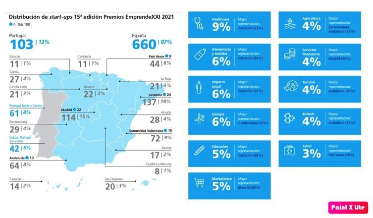 Por sectores, Cataluña destaca en empresas dedicadas al healthcare, la alimentación, el impacto social y la educación, mientras que Madrid es el territorio que un mayor número de empresas registra especializadas en marketplace y en servicios financieros. Por su parte, la Comunidad Valenciana destaca por ser la región con más start-ups del sector de la energía y el País Vasco concentra el mayor núcleo de emprendedores de salud. Andalucía es líder en turismo y, de forma compartida con Extremadura, en agricultura.