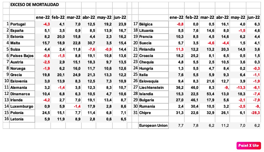 Así tenemos que Portugal, nuestro país vecino, que tiene un exceso negativo en enero, en junio ha tenido un exceso del 23,9%, que es asombrosamente alto.
