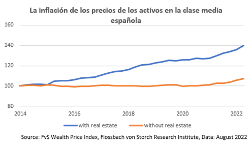 En el caso de la propiedad inmobiliaria, esto es totalmente diferente. En un periodo relativamente corto de ocho años, los propietarios de inmuebles de la clase media española pueden disfrutar de un incremento del 40 % en el precio de sus activos. El motivo es que sus inmuebles han subido de precio casi un 50 %.