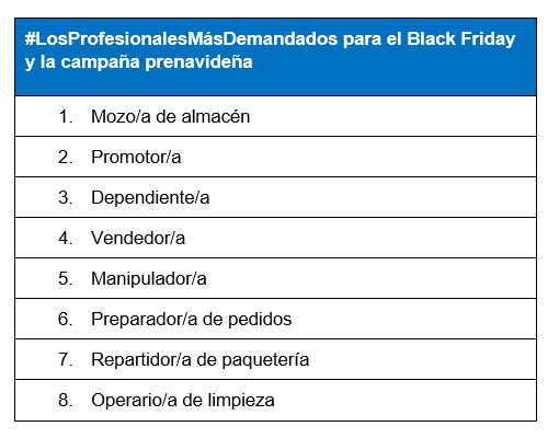 Respecto a los profesionales que más están demandando de cara a la campaña, destacan mozo/a de almacén, promotor/a y dependiente/a, que se cuela en el top 3.