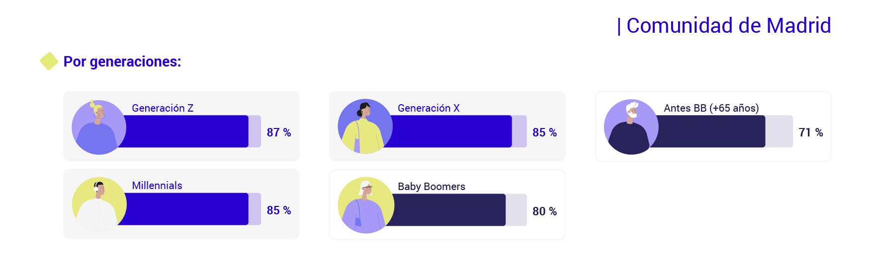 Un año más, las generaciones más jóvenes vuelven a ser las que presentan datos de mayor consumo y confianza en las compras online. En este período marcado por la inflación, son quienes más creen que realizar transacciones digitales les puede ayudar a ahorrar encontrando precios más bajos en internet, o eliminando los desplazamientos, por ejemplo. Así, hasta el 87% de los miembros de la generación Z está convencido de ello, cinco puntos por encima de la media madrileña. Por su parte, hasta el 85% de la generación Millennial y la generación X también lo piensan. Aunque no dejan de presentar cifras reseñables, este porcentaje disminuye en los Baby Boomers (80%) y en las personas nacidas antes de esta generación (71%).