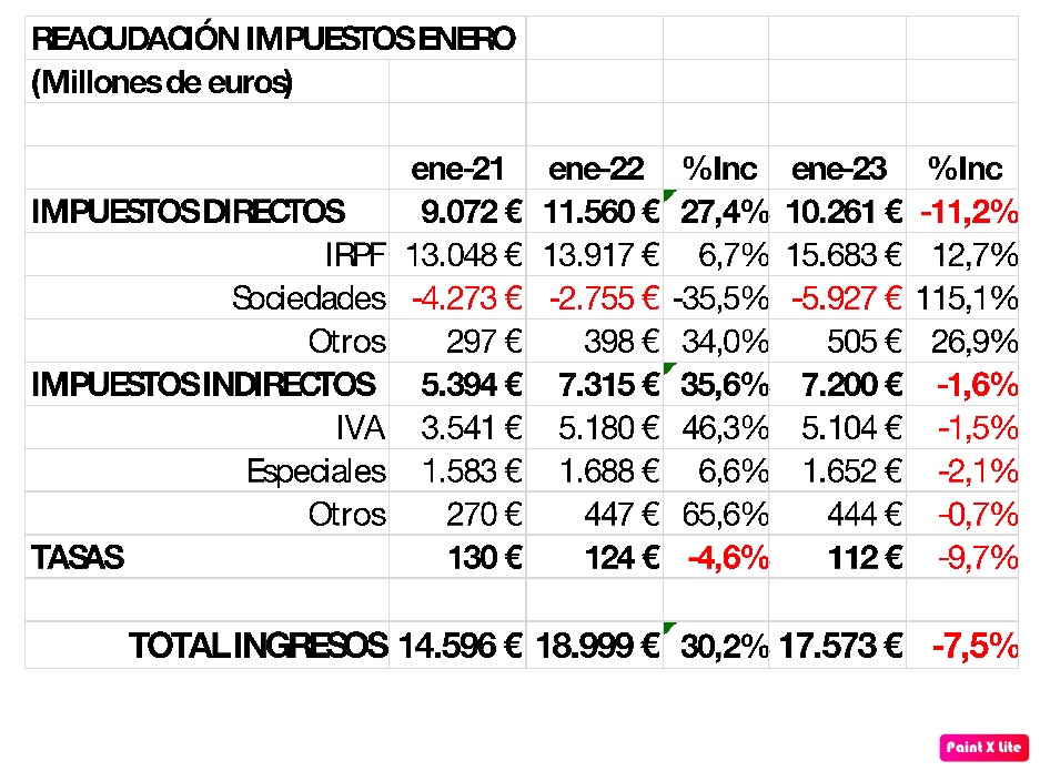 Así tenemos que, en los impuestos indirectos, en enero se recauda también menos que en enero de 2022 con una caída del 1,6%. Los impuestos especiales, a pesar del impuesto a los plásticos que ha recaudado 1 millón de euros, no se me rían queridos lectores, si han leído correctamente, 1 millón de euros es lo recaudado en el mes de enero como impuesto especial a los envases de plástico. El resto de los impuestos prácticamente ha sido igual que en el 2022, menos el de hidrocarburos, que ha caído en 13 millones por la bajada de los precios de la gasolina comparada con la misma fecha del año anterior y eso que los 20 céntimos de ayuda desaparecieron en diciembre.