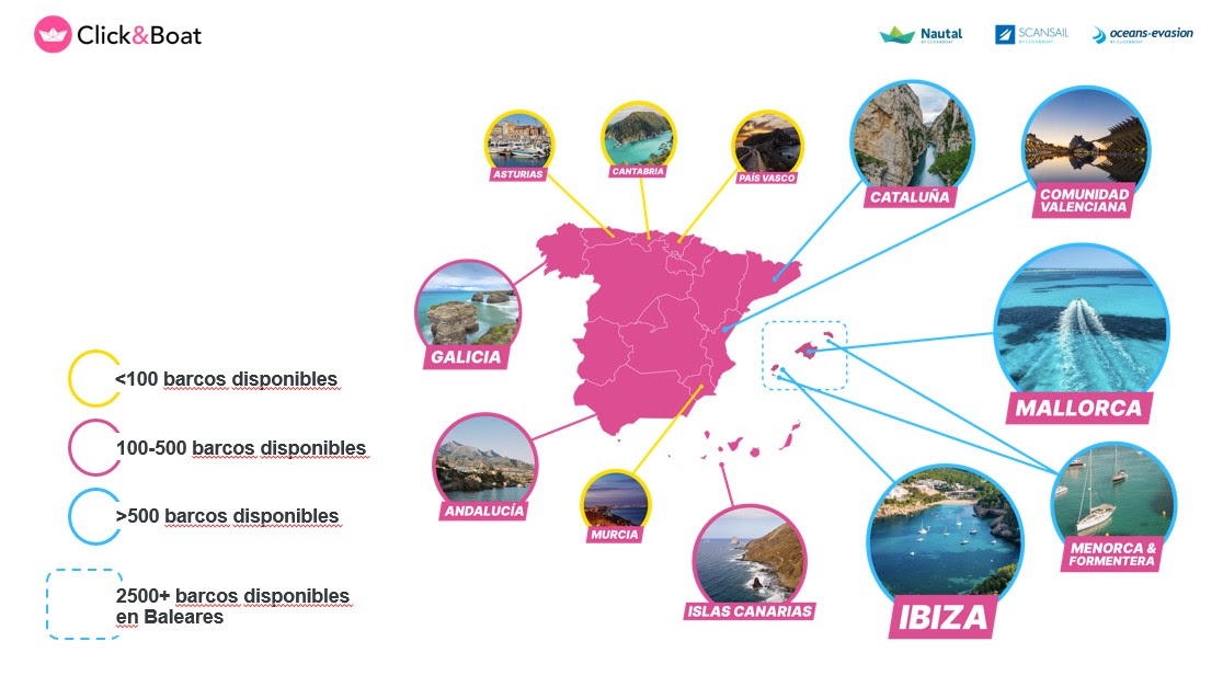 Concretamente en el mercado español, la plataforma permite alquilar barcos en puertos de toda la costa del país, pero el punto donde más barcos hay disponibles es el archipiélago balear, con más del 50% de la flota total de España en él. Además, entre las Islas Baleares, Mallorca es la isla que más barcos tiene en su costa listos para alquilar. En cuanto a la península, Valencia es la costa con más barcos fondeados para alquilar a través de Click&Boat.