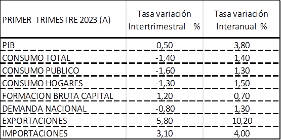 Los datos adelantados de contabilidad nacional correspondientes al primer trimestre de 2023 publicados por el INE reflejan que el PIB ha crecido en el trimestre el 0,5%, ligeramente superior a nuestra estimación del 0,3%-0,4%, y, en tasa interanual, el 3,80%, 0,9 décimas superior a la variación del trimestre anterior, debido fundamentalmente al mejor comportamiento de la demanda externa cuya aportación al crecimiento del PIB ha sido de 2,5 frente al 1,3 aportado por la demanda interna.