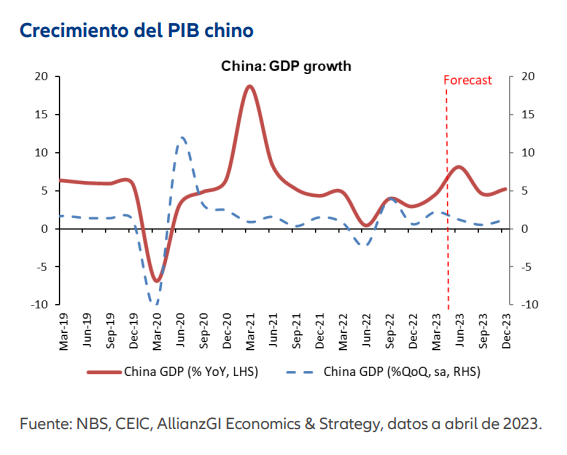“El informe del PIB del primer trimestre de 2023 evidencia la rápida y sólida recuperación del crecimiento de China tras la reapertura. En términos interanuales, el crecimiento general del PIB fue superior al previsto, con un 4,5% interanual, lo que supone una aceleración con respecto al 2,9% interanual del trimestre anterior (4º trimestre de 2022). Sobre una base secuencial trimestral, el PIB repuntó un 2,2%, superando también las previsiones de consenso y acelerándose desde el 0,6% del trimestre anterior”.
