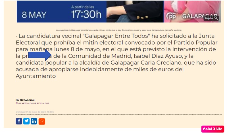 Como sabrá, el pasado 7 de mayo de 2023, sin ninguna previa comprobación ni contraste por parte de su medio -el medio de comunicación digital elmundofinanciero.com, que Ud. dirige y edita, según aparece, entre otros, en su perfil de Instagram @joselubarcelo o en el de LinkedIn-, y bajo una anónima firma de "Redacción", esto es, firmado por Ud. mismo, en persona, como responsable jurídico, se publicó la entrada: «Una candidatura vecinal de Galapagar intenta paralizar un "mitin" de Ayuso por ser electoral y estar fuera del periodo de Campaña».