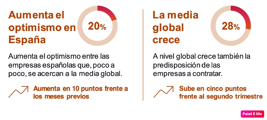 A nivel global, el grado de optimismo crece en la comparativa intertrimestral, concretamente 5 puntos, con unas previsiones netas del 28%. España se sitúa así 8 puntos por debajo de esta media, en línea con Francia (21%) y por delante de Italia (11%). Portugal se sitúa por encima de la media española y roza la global, con un 27%, tras un crecimiento de 11 puntos en comparación con los últimos 3 meses.