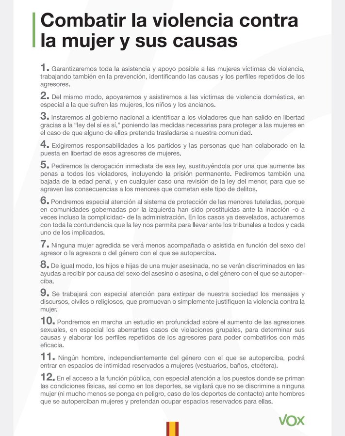 La totalidad o mayoría de estas líneas son aceptadas por una gran mayoría de socialistas, así como por los votantes de centro derecha y por los electores de partidos no independentistas. ¿Qué ganaría VOX con hacer esta propuesta? Dejaría clara su postura ante temas de Estado e impulsaría a que PSOE y PP clarificaran sus posturas y dieran prioridad a promover la convivencia democrática nacional que es urgente en estos momentos.