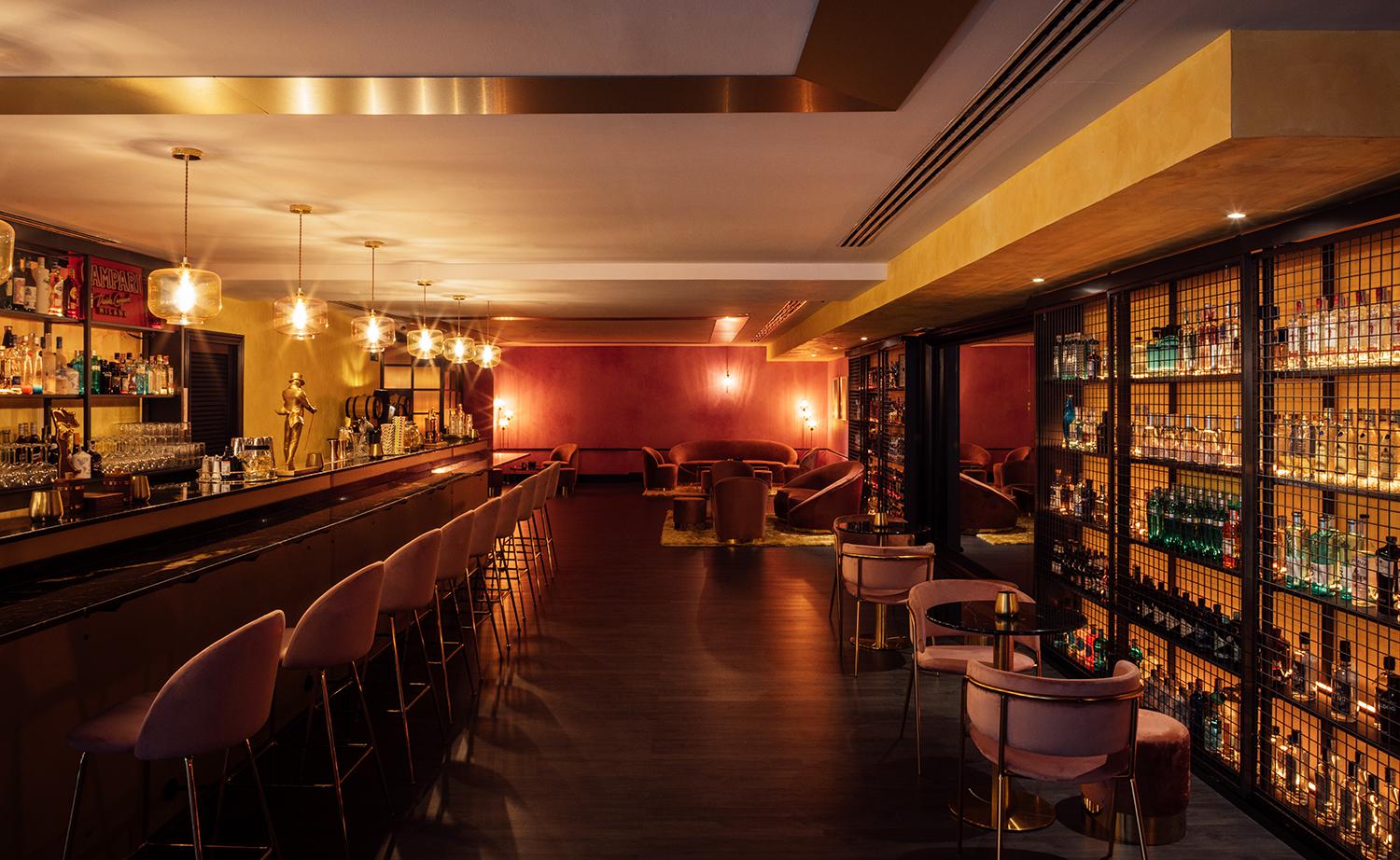 La iluminación indirecta procede de los propios botelleros y de apliques en pared para generar las sombras que proyectan las formas redondeadas de los muebles, por eso del Déco streamline, le dieron al local un toque de boîte setentera en donde un punto kistch terminó aflorando.
