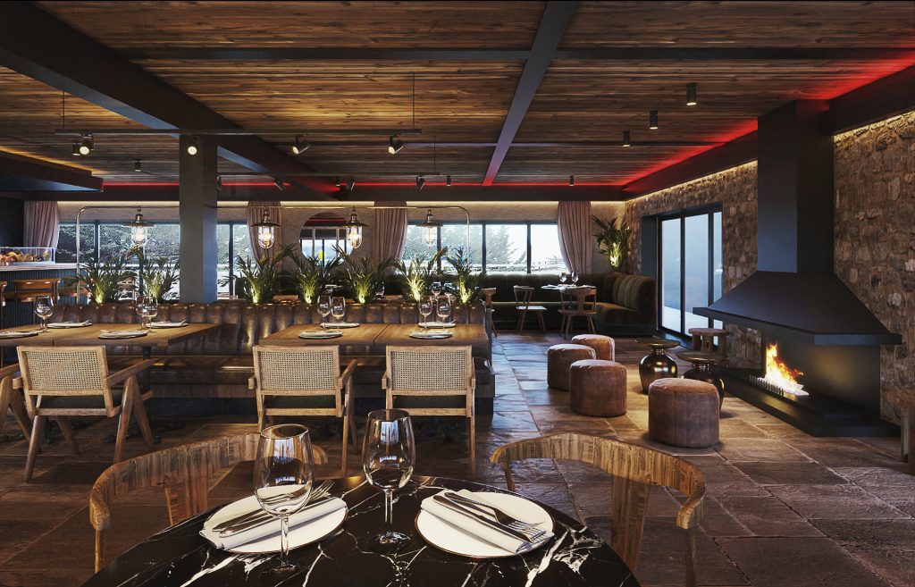 Traspasar las puertas de Lobo es adentrarse en el corazón de la Sierra de Ayllón, un espacio, obra del estudio de arquitectura Néstor Marcos Architecture, inspirado por el entorno montañoso y la esencia de la estación de esquí, fusionando elementos naturales y modernos. Con la utilización de maderas autóctonas y piedras locales, ha logrado un ambiente acogedor y sofisticado que refleja la naturaleza circundante. El mobiliario y la iluminación acentúan la calidez y elegancia, mientras que las ventanas panorámicas permiten a los comensales disfrutar de impresionantes vistas de las montañas.