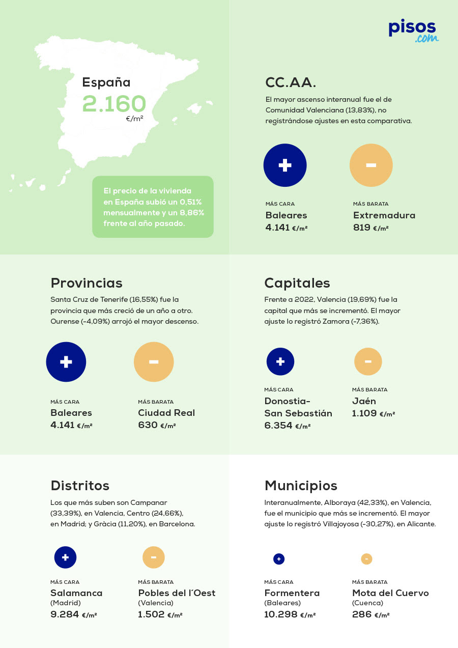 Las mayores subidas frente a 2022 se dieron en Alboraya (42,33%), en Valencia; Godella (42,27%), en Valencia; y La Seu d’Urgell (42,03%), en Lleida. Las que más bajaron fueron Villajoyosa (-30,27%), en Alicante; Elche (-30,26%), en Alicante; y Aramaio (-27,12%), Álava. Ordenando los municipios por precio, se colocaron en los primeros puestos Formentera (10.298 €/m²), Santa Eulàlia Des Riu (7.558 €/m²) y Sant Josep de Sa Talaia (6.950 €/m²), todos ellos en Baleares. La parte baja del listado la encabezaron Mota del Cuervo (286 €/m²), en Cuenca; Peñarroya-Pueblonuevo (300 €/m²), en Córdoba; y Tamarite de Litera (327 €/m²), en Huesca.