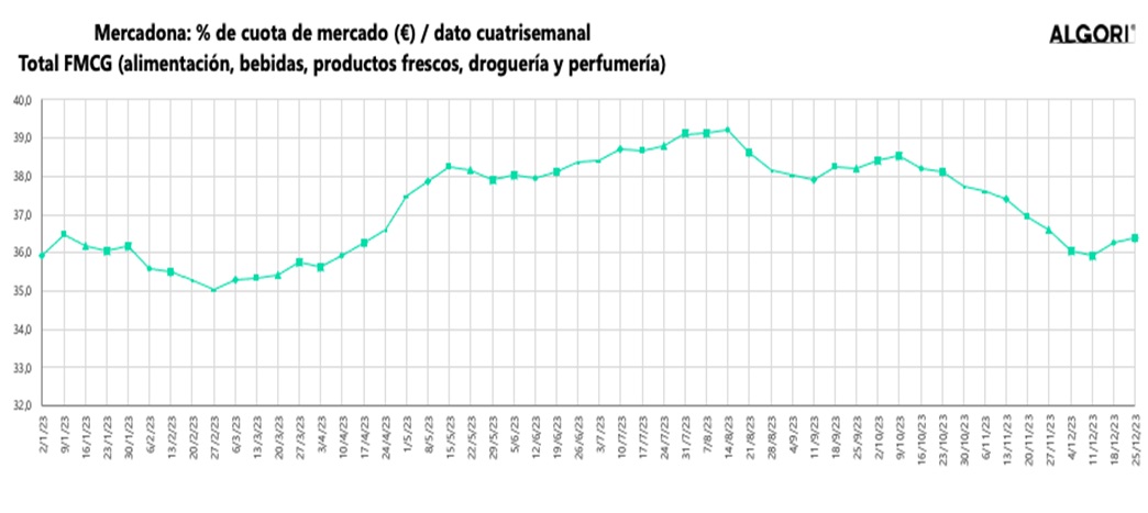 Sin duda una buena campaña de Navidad ha contribuido de forma más que positiva a Mercadona que consigue cerrar el 2023 con una ganancia de +1,9 puntos de cuota de mercado en el cómputo total del año.