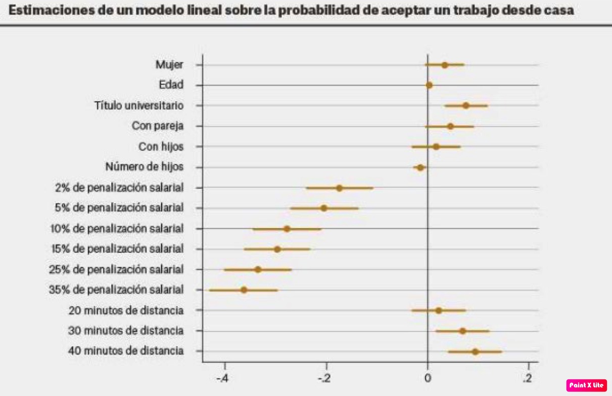 De este modo, cuando el recorte salarial es de más del 10 %, la probabilidad de aceptar la oferta laboral con posibilidad de teletrabajar se reduce en más de 20 puntos porcentuales. Esta probabilidad cae casi 40 puntos porcentuales cuando la penalización salarial se sitúa en el 35 %.