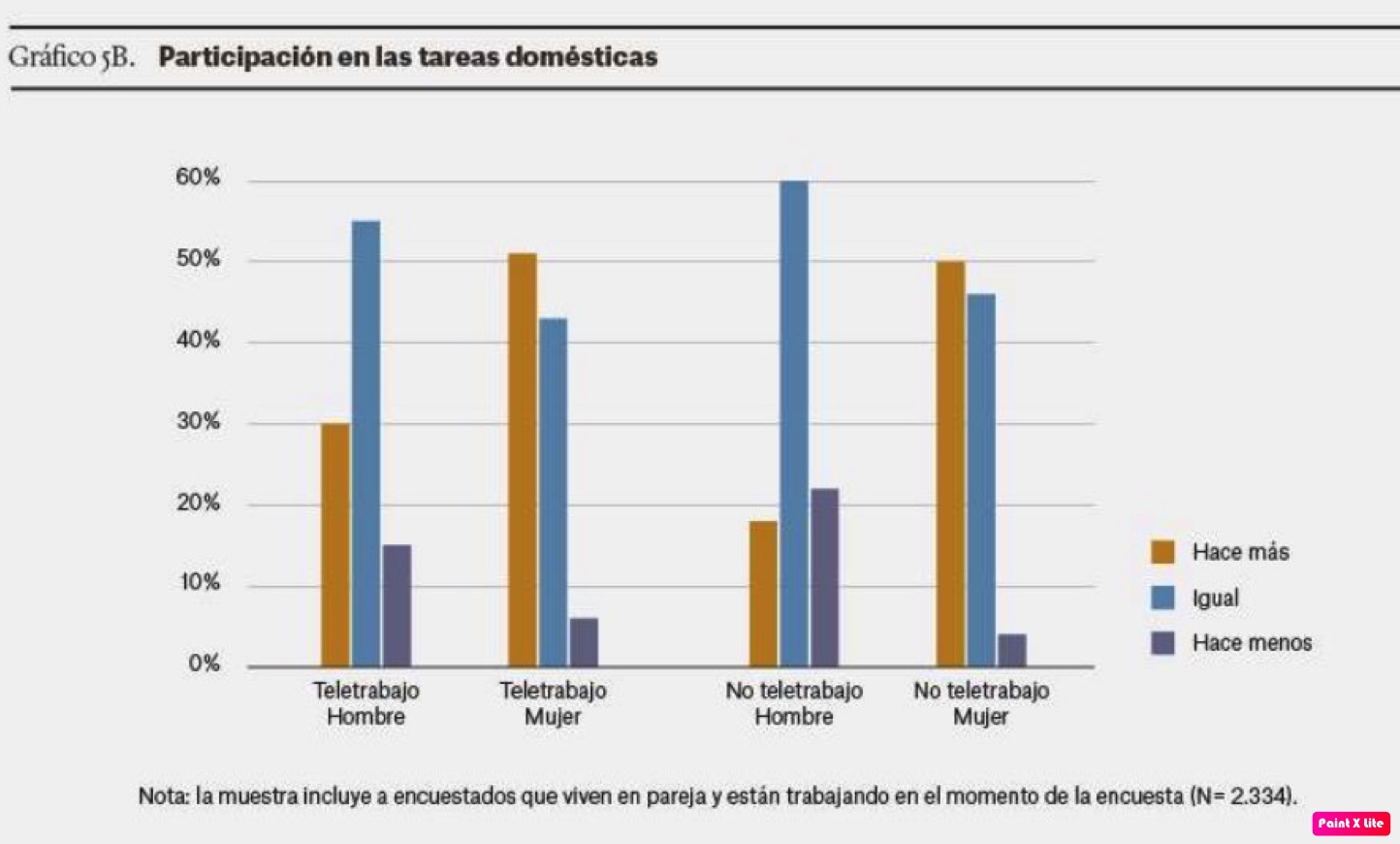 Si el foco se pone en el cuidado de los hijos, el 48 % de las mujeres que teletrabajan declara contribuir más que sus parejas a las actividades de cuidado, mientras que el 47 % afirma hacerlo en una proporción similar. Entre los hombres que trabajan desde casa, al menos un día a la semana, el 24 % afirma hacer más que sus parejas en las actividades de los niños, y el 59 % asegura contribuir en una proporción similar.