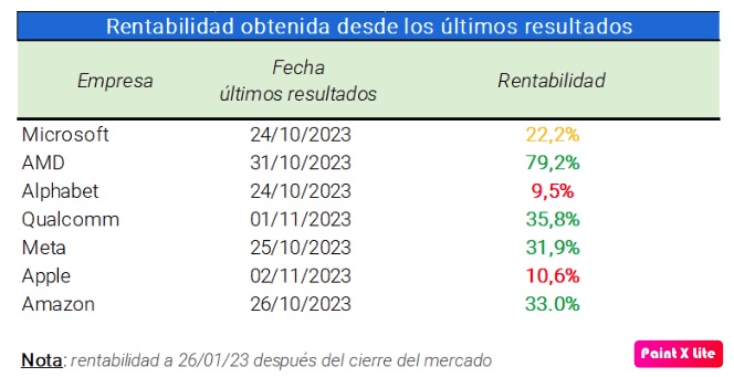 Además, la rentabilidad obtenida por la mayor parte de ellas ha superado con creces la media del mercado desde la última vez que presentaron resultados como vemos en la tabla debajo, siendo la primera de ellas AMD con un increíble 79%.