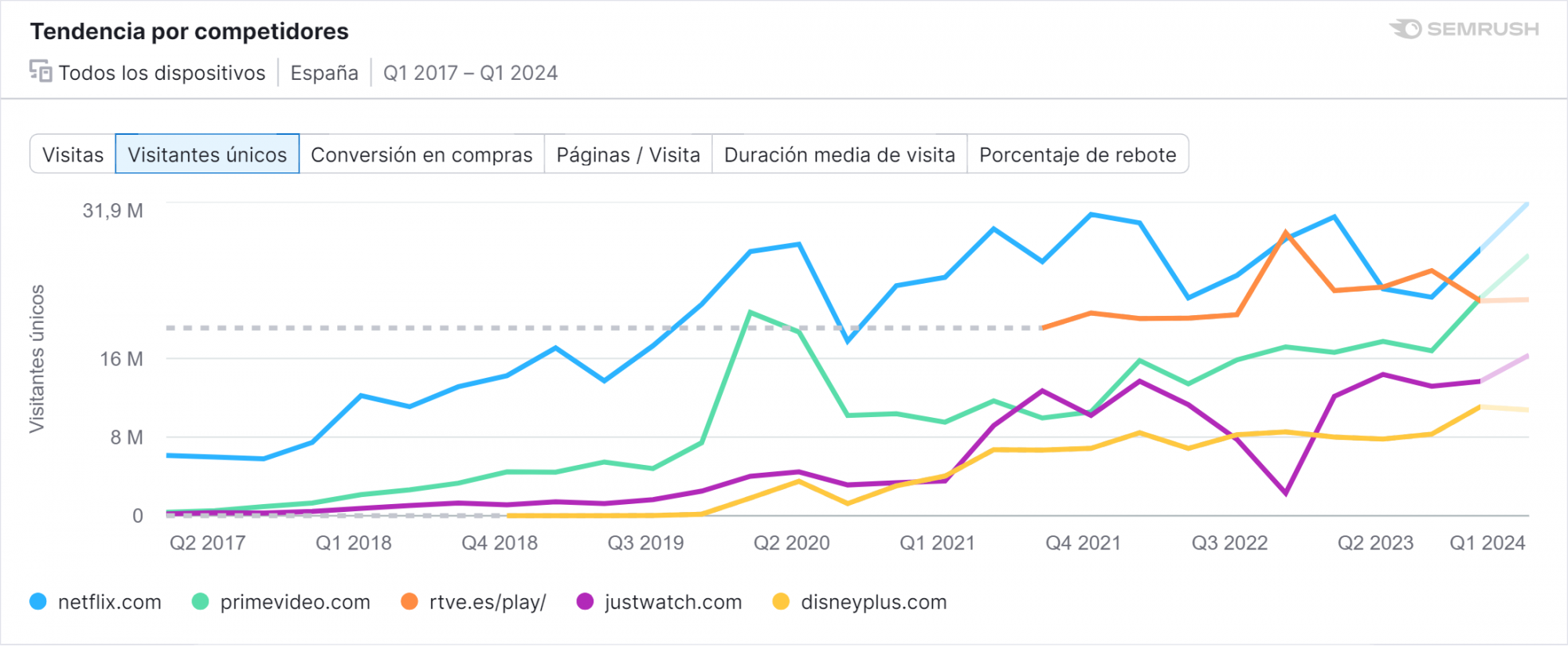 Los grandes favoritos se han mantenido constantes durante los últimos años, si bien han ido apareciendo nuevos actores que han llamado la atención del público español, como fue el caso de RTVE Play en 2021. Según el análisis de la compañía, en 2024, las audiencias de las principales plataformas de streaming mantienen audiencias que superan los millones de usuarios, siendo la siguiente lista, las diez principales plataformas en función del número de sus visitantes únicos: