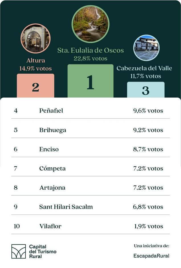 De los cerca de 80.000 votos emitidos en esta VIII edición del certamen, el 22,8% han ido a favor de Santa Eulalia de Oscos logrando así el primer puesto, quedando 7,9 puntos por delante del segundo clasificado, el pueblo de Altura en Castellón. “Felicitamos a Santa Eulalia y a todos sus vecinos por alzarse con el título de Capital del Turismo Rural 2024 y también a los otros nueve municipios que fueron elegidos finalistas entre las más de 200 candidaturas recibidas por parte pueblos de todas las comunidades autónomas en esta octava edición del certamen”, explica Judith Monmany, responsable de comunicación de EscapadaRural.
