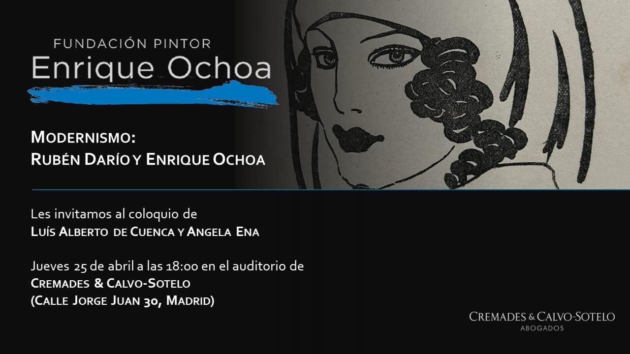 CREMADES & CALVO-SOTELO acoge el 25 de abril a las 18:00, el coloquio MODERNISMO: RUBÉN DARÍO Y ENRIQUE OCHOA, organizado por la FUNDACIÓN PINTOR ENRIQUE OCHOA. Este coloquio se desarrollará con la participación del Premio Nacional de Poesía (2015) y miembro de la Real Academia de Historia LUÍS ALBERTO DE CUENCA y la Catedrática de Filología Española y experta en literatura del siglo XIX y XX ANGELA ENA. Junto a estos magníficos ponentes descubriremos los entresijos del arte que llevaron a cabo de manera conjunta RUBÉN DARÍO Y ENRIQUE OCHOA.