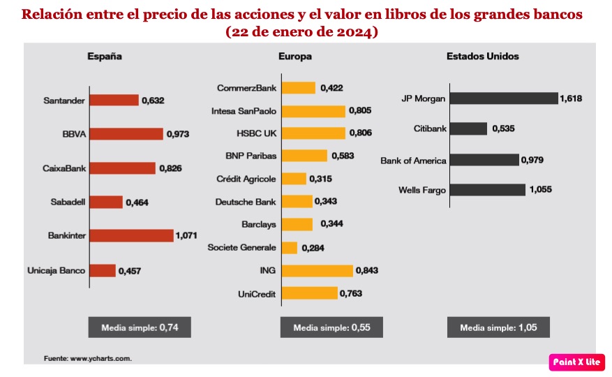 Frente a esta corriente de opinión, los inversores creen que la rentabilidad de la banca no es suficiente. Al menos, eso se deduce del hecho de que el precio de la acción de la mayor parte de los bancos españoles y europeos sigue por debajo de su valor en libros, lo cual es un síntoma de falta de confianza en la capacidad del sector para seguir generando beneficios en el futuro. Pese a que en 2023 la cotización de las acciones de los principales bancos españoles subió más de un 25%, solo una tenía a principios de 2024 un precio por encima de su valor en libros, mientras otra se situaba muy cerca del equilibrio. El resto estaba por debajo. En Europa, la situación era aún peor.