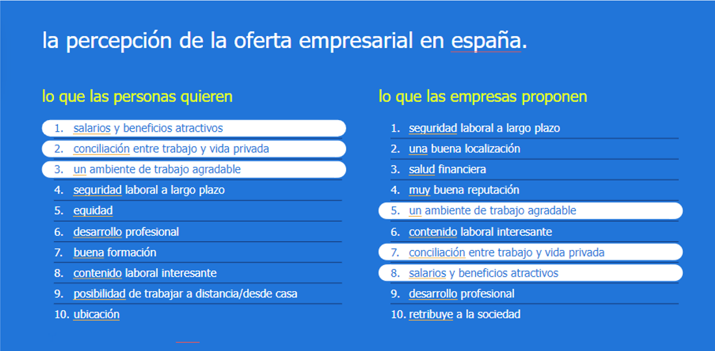 Las prioridades expresadas por las personas van en la línea de salario, conciliación, ambiente de lugar de trabajo, cuando las empresas priorizan en sus comunicaciones factores más relacionados con seguridad, buena localización o salud financiera.