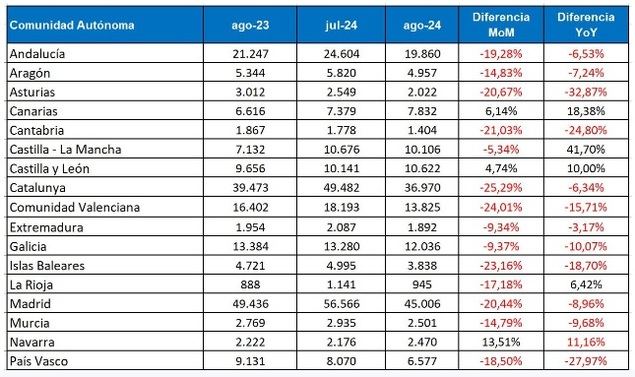 En el análisis de indicadores a nivel de comunidades autónomas, destacan principalmente Canarias y Castilla y León, por ser las que más crecen con respecto a julio y frente a agosto de 2023.