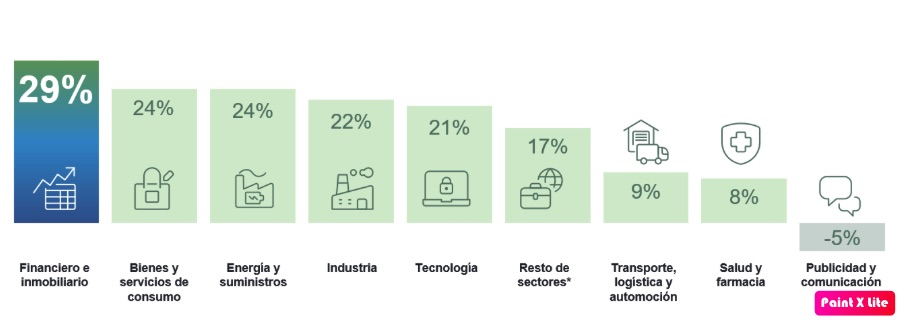El sector Financiero e inmobiliario se posiciona como el más optimista en términos de expectativa de generación de empleo, con una previsión neta del 29%, lo que supone un aumento de 17 puntos respecto al trimestre anterior. Bienes y servicios de consumo y Energía y suministros le siguen de cerca, ambos con un 24%.