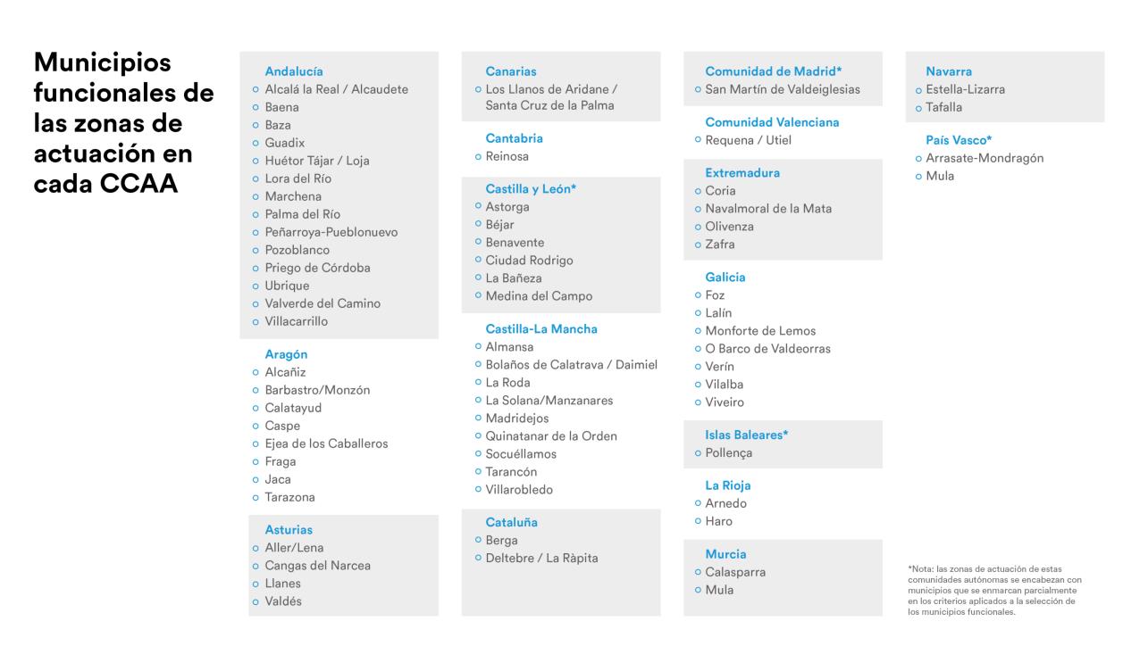 La convocatoria se dirige a 67 zonas de actuación distribuidas per las 17 comunidades autónomas y organizadas en torno a un municipio funcional donde se concentran servicios y actividades económicas. La selección de dichas zonas de actuación, alineada con los objetivos del Ministerio para la Transición Ecológica y el Reto Demográfico, se ha realizado a través de un conjunto de criterios cuantitativos en aquellas zonas que sufren despoblación (es decir, que han perdido población en los últimos diez años) y tienen una densidad de población inferior a 100 hab./km2.