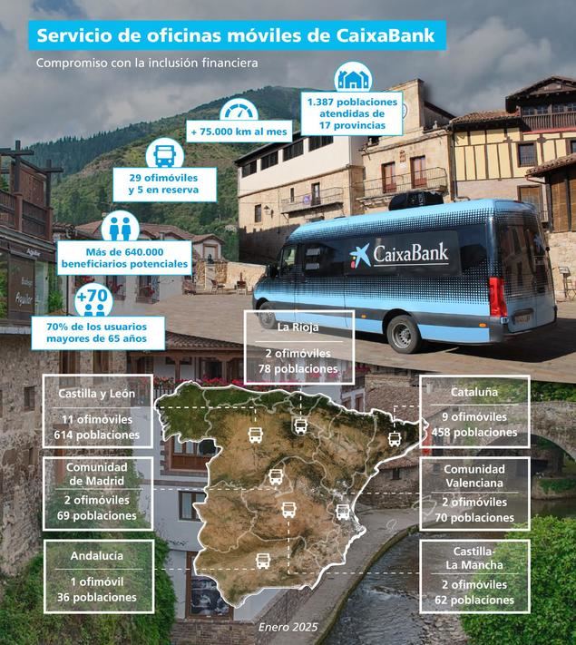 CaixaBank cuenta con un total de 34 oficinas móviles, 29 de las cuales recorren más de 75.000 kilómetros de media al mes y prestan servicio en 17 provincias de siete comunidades autónomas: Ávila, Burgos, León, Palencia y Segovia, en Castilla y León; Ciudad Real, Guadalajara y Toledo, en Castilla-La Mancha; Castellón y Valencia, en la Comunidad Valenciana; Granada, en Andalucía, la Comunidad de Madrid, La Rioja y las cuatro provincias de Cataluña.