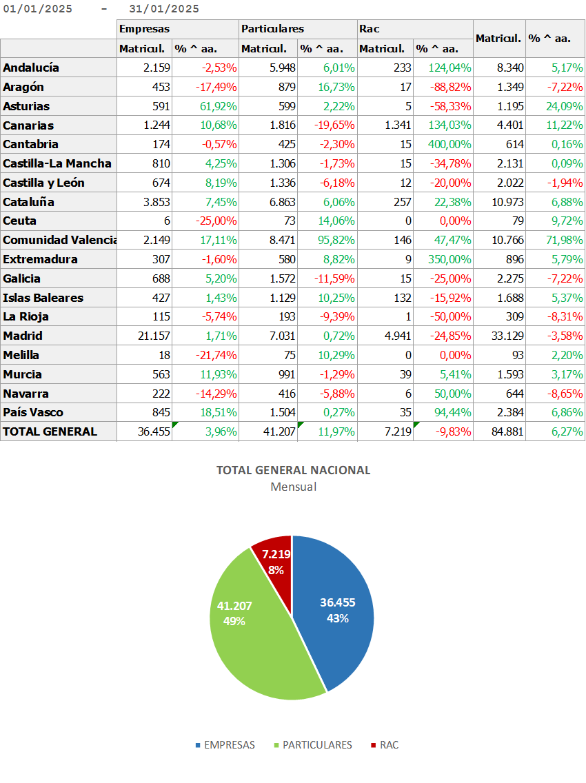 El Rent a Car cerró el pasado mes de enero con una caída del 9,83% en las matriculaciones de vehículos -entre turismos e industriales-, situándose en la cifra de 7.219 unidades, según datos de la consultora MSI para FENEVAL. Así, el canal inicia el 2025 con una caída en comparación al mismo mes del anterior ejercicio, momento en el que las matriculaciones se posicionaron en las 8.006 unidades. Por su parte, el canal de empresas arranca enero de manera positiva con un incremento del 3,96%, situándose en las 36.455 unidades. Asimismo, el canal de particulares lo hace con un crecimiento del 11,97% -41.207 unidades.
