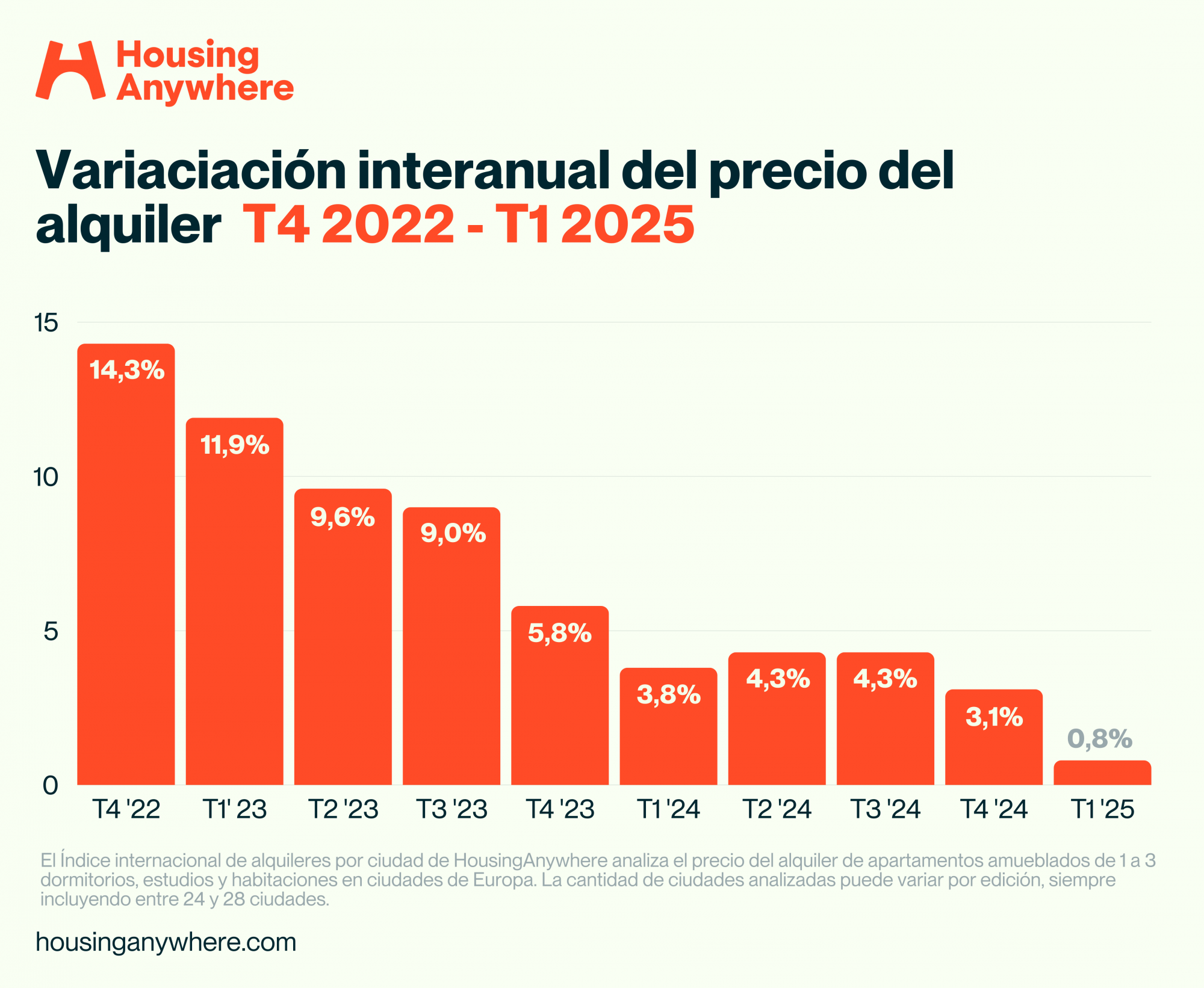 El Índice internacional de alquileres de HousingAnywhere del primer trimestre de 2025 revela un incremento anual del 0,8% en los precios del alquiler en Europa, lo que indica una estabilización del mercado tras años de crecimiento continuo. El informe, que analiza los precios del alquiler en 27 ciudades europeas para las propiedades amuebladas publicadas en la plataforma HousingAnywhere, muestra una notable caída en el precio del alquiler de apartamentos, que disminuyó un 2,9%. Por otro lado, los alquileres de habitaciones se encarecieron un 2,2% y los estudios experimentaron el incremento más pronunciado, de un 3,7%.