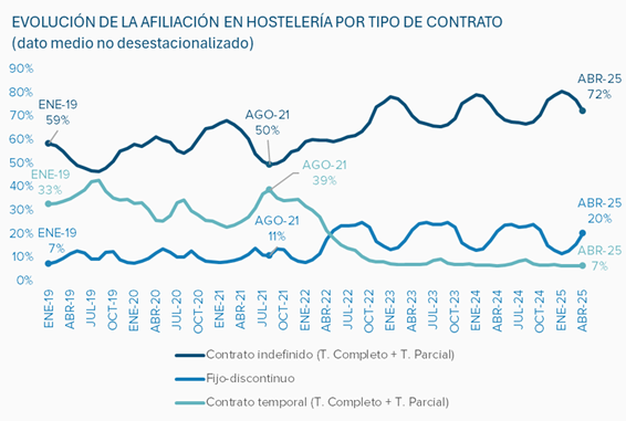 Por otro lado, los datos de la Seguridad Social muestran que actualmente en hostelería trabajan 1.132.576 personas con un contrato indefinido, que se reparten entre un 60 % cuyo contrato es a tiempo completo (677.643 afiliados) y un 40 % que trabaja a tiempo parcial (454.933 personas). Aparte de las personas que están vinculadas a la empresa mediante esta modalidad contractual, hay 104.381 personas con un contrato temporal y 318.397 con uno de tipo fijo-discontinuo.