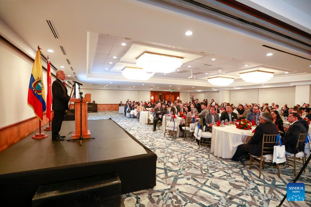 Imagen del 28 de abril de 2025 del embajador de China en Ecuador, Chen Guoyou (i), pronunciando un discurso durante la ceremonia de conmemoración del primer aniversario de entrada en vigor del Tratado de Libre Comercio (TLC) entre Ecuador y China, organizada por la Cámara de Comercio Ecuador-Shanghai-China, en la ciudad de Quito, capital de Ecuador. Autoridades de Ecuador y China conmemoraron el primer aniversario de la entrada en vigor del TLC entre ambos países, que se cumple el próximo 1 de mayo, destacando los logros alcanzados en el fortalecimiento del intercambio comercial bilateral. (Xinhua/Ricardo Landeta)