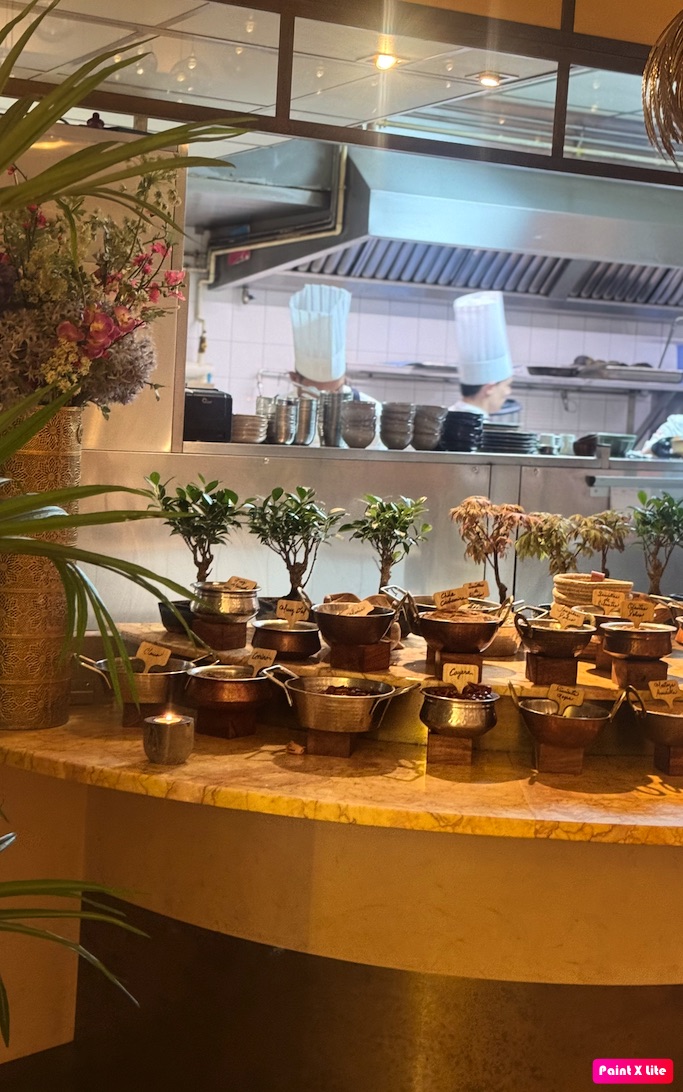 El restaurante ofrece un ambiente cálido y sofisticado que se reparte entre un comedor amplio y luminoso, una terraza interior ajardinada donde llama la atención un precioso estanque iluminado y un bar de acceso directo desde la calle donde disfrutar de riquísimas tapas indias y una formidable coctelería de autor.