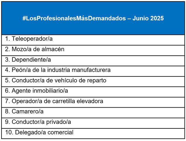 En referencia a los puestos de trabajo con más demanda en junio, estos son los que ocupan las primeras posiciones.