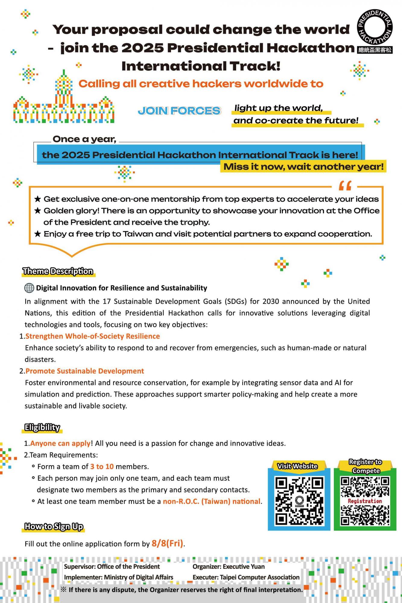 · El Hackathon Presidencial de Taiwán, una iniciativa puesta en marcha en 2019 por la Oficina Presidencial de la República de China (Taiwán), celebra este año su 7ª edición bajo el lema “Innovación digital para la resiliencia y la sostenibilidad”, haciéndose eco de los 17 Objetivos de Desarrollo Sostenible (ODS) 2030 establecidos por las Naciones Unidas