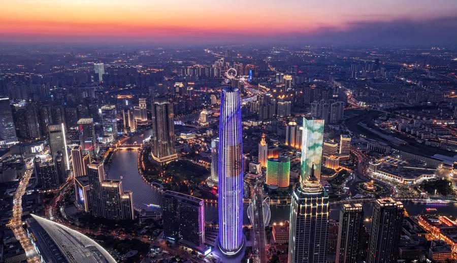 Imagen del 20 de junio de 2025 de una vista nocturna de la ciudad, en la municipalidad de Tianjin, en el norte de China. (Xinhua/Sun Fanyue)