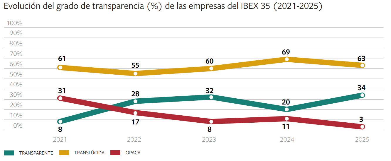 Tras cinco años evaluando la transparencia en las prácticas de compliance de las empresas, la Fundación Haz aplaude una fase de madurez en las compañías del IBEX 35, detectando un cambio que va de contar con políticas y prácticas aisladas y fragmentadas a la creación de un sistema más integral de compliance. Así lo desprende en la edición 2025 del informe anual, realizado con el apoyo de la Asociación Española de Compliance (ASCOM) y disponible en www.hazfundacion.org, que refleja una clara transición de la opacidad a la transparencia. Un 34% de las empresas del IBEX 35 son catalogadas este año como transparentes, mientras que en el primer informe de 2021 era solo un 8%. Pero la señal más certera de esta evolución lo muestra la categoría de empresas opacas, que es prácticamente residual, cayendo del 31% a solo un 3% en un lustro. El restante 63% se clasifica en el grupo de translúcidas.