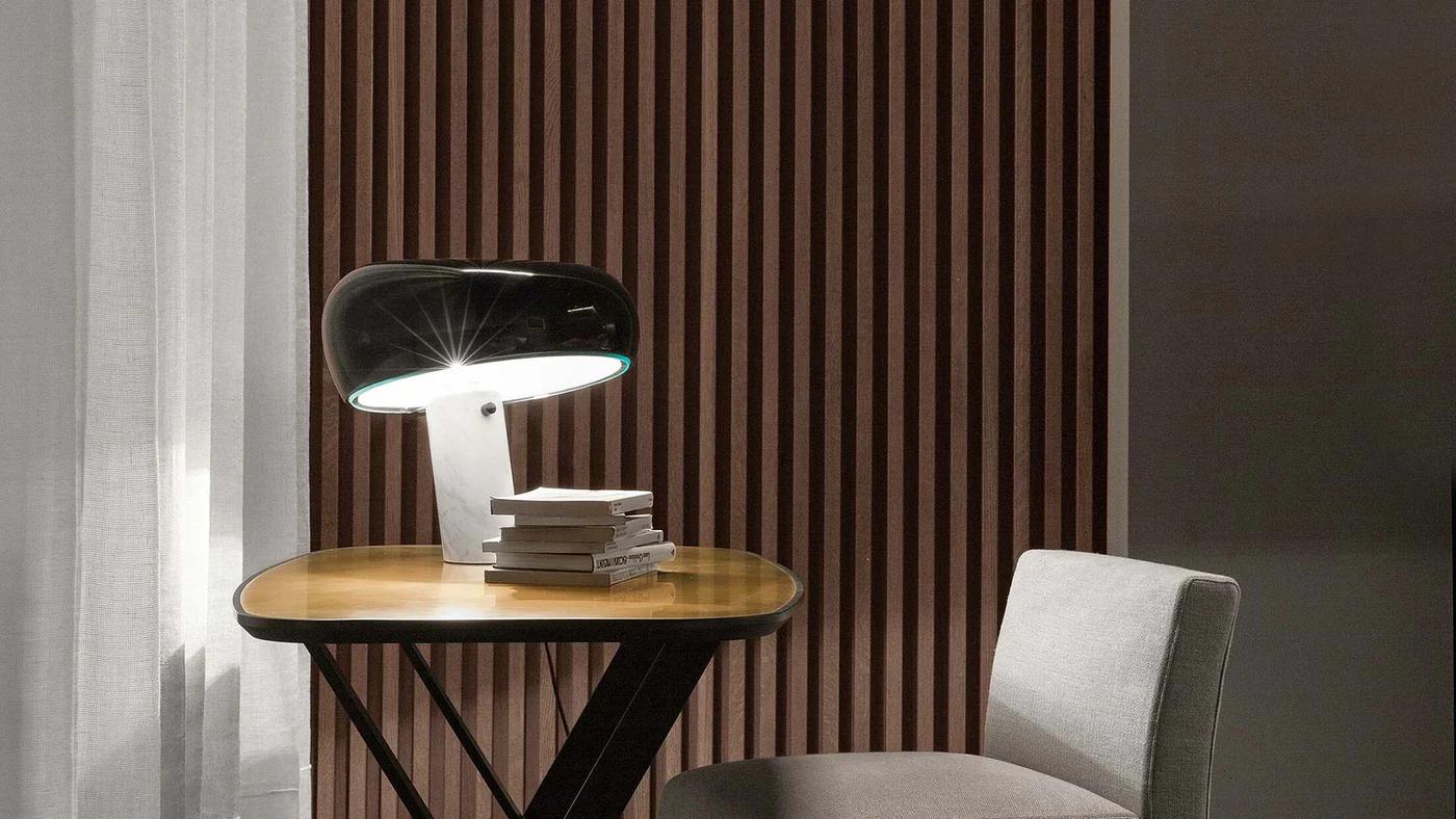 Por su parte, la lámpara Snoopy de Flos, diseñada en 1967 por Achille y Pier Giacomo Castiglioni, combina mármol blanco y metal negro en una composición llena de humor y elegancia. Inspirada en el célebre personaje de Charles Schulz, su pantalla inclinada refleja la ironía inteligente de los maestros del diseño italiano. Más que una lámpara, es un gesto de luz que evoca el espíritu lúdico de la época.