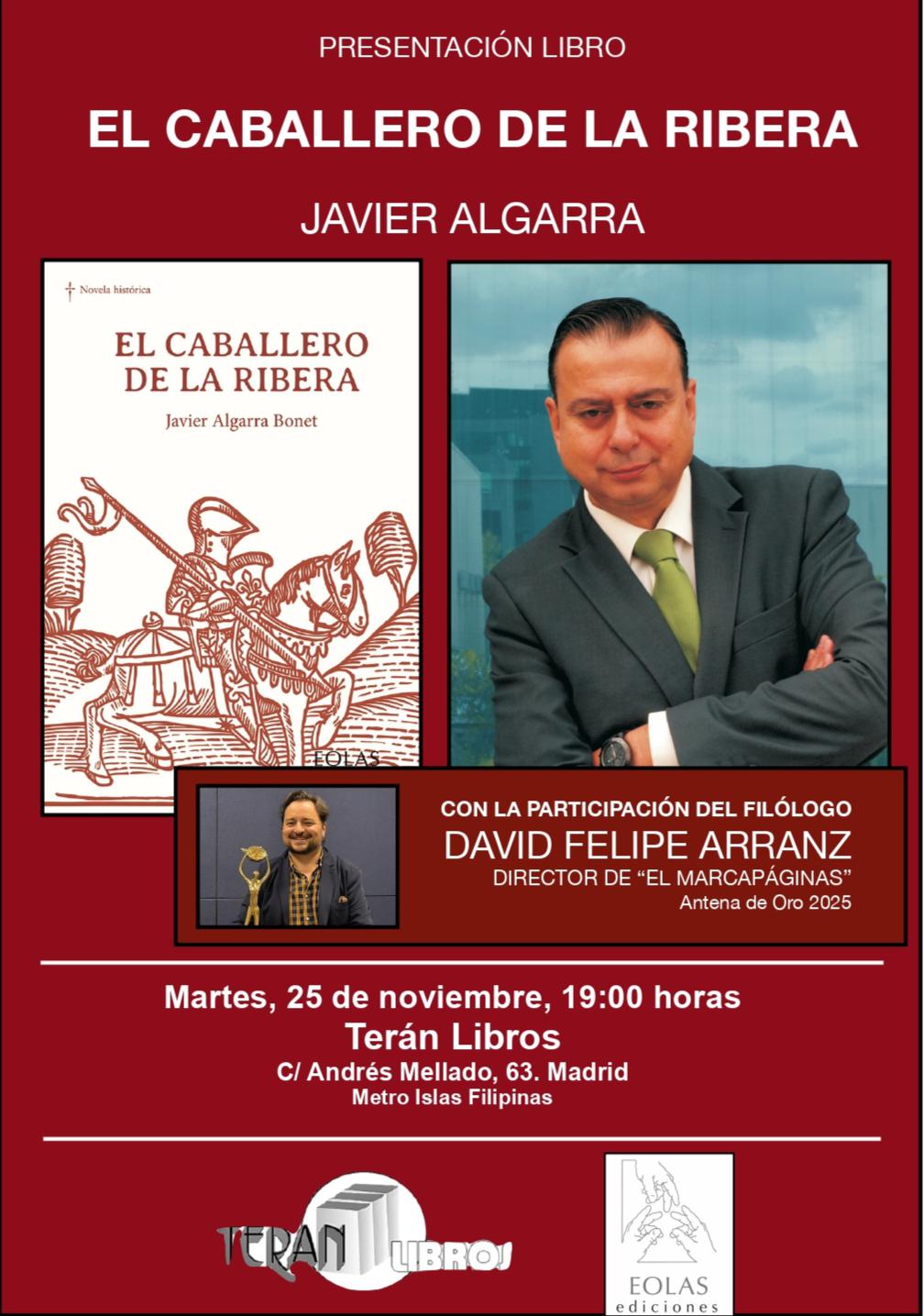 "El caballero de la Ribera" es la segunda novela de Javier Algarra. La primera, titulada "Quizá por eso nos llaman números", resultó ganadora del primer Premio de Relatos Cortos convocado por APROGC, la Asociación Pro Guardia Civil.